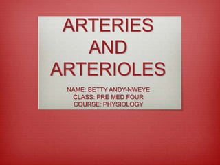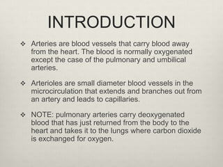 This document discusses the anatomy and function of arteries and arterioles. It defines arteries as blood vessels that carry oxygenated blood away from the heart, while arterioles are smaller vessels that branch off arteries and lead to capillaries. The document then describes the two types of arteries - elastic and muscular arteries - and provides examples of each. It also outlines the three layers (tunica) that make up the wall of arteries - the innermost intima layer, middle media layer, and outer adventitia layer. Finally, it states that arterioles have the greatest influence on local blood flow and overall blood pressure through their ability to variably contract.
