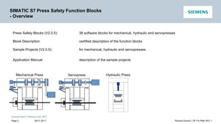 The document describes Siemens press safety function blocks for SIMATIC S7 controllers. It includes 38 software blocks for monitoring safety functions on mechanical, hydraulic, and servo presses. The blocks are pre-certified and parameterized. The document provides an overview of the blocks, ordering information, technical support contacts, block properties, applicable standards and certifications, and a list of the available blocks and their functions.