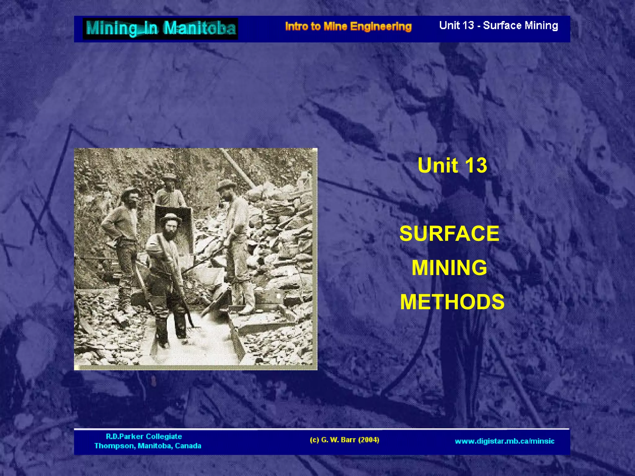 This document provides an overview of various surface mining methods. It begins by defining surface mining as extracting ore that lies near the surface by removing overburden. It then discusses the history of surface mining and factors to consider for evaluating surface deposits, including geography, legal issues, and economics. Specific surface mining methods covered include placer mining using panning, sluicing, hydraulicking, and dredging, as well as strip mining and open pit mining.