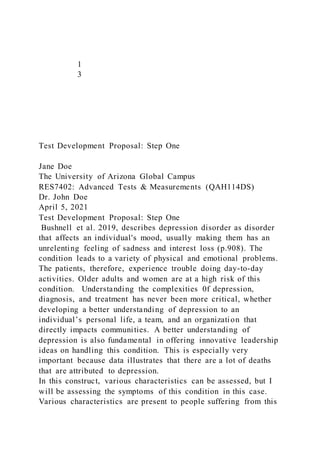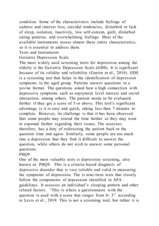 The document discusses various aspects of depression, highlighting its symptoms, affected demographics, and the importance of understanding and addressing this mental health condition. It reviews several assessment tools, including the Geriatric Depression Scale, PHQ-9, Hamilton Rating Scale, and DSM-5, noting their strengths and limitations in diagnosing and monitoring depression. Additionally, it emphasizes the significance of the American Psychological Association's treatment guidelines in managing depressive disorders across all age groups.