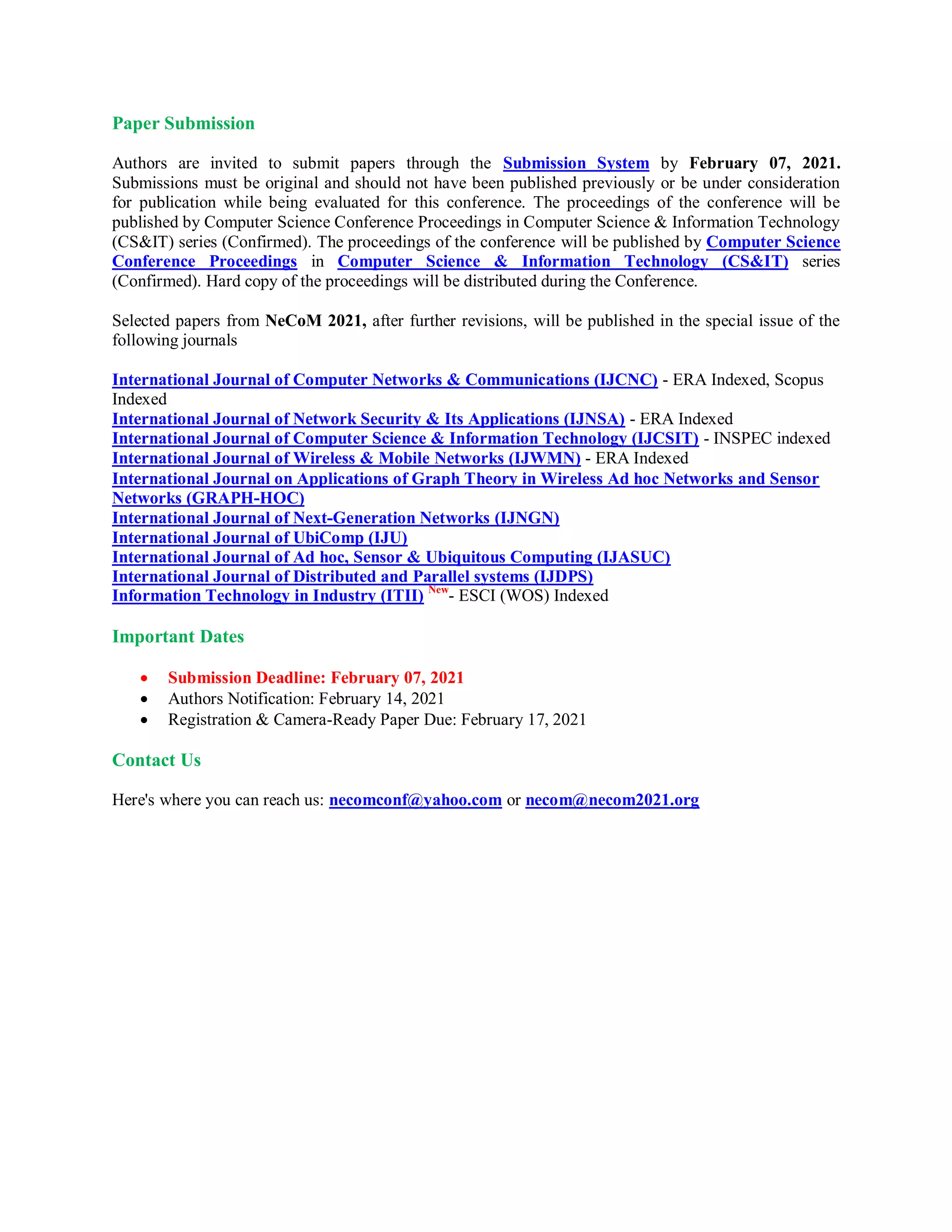The 13th International Conference on Networks & Communications (NECOM 2021) will take place from February 20-21, 2021, in Dubai, UAE, focusing on the latest developments in computer networks and data communications. The conference invites original papers on various topics, including wireless networks, network security, and performance analysis, with submission deadlines set for February 7, 2021. Selected papers will be published in special issues of indexed journals following the conference.