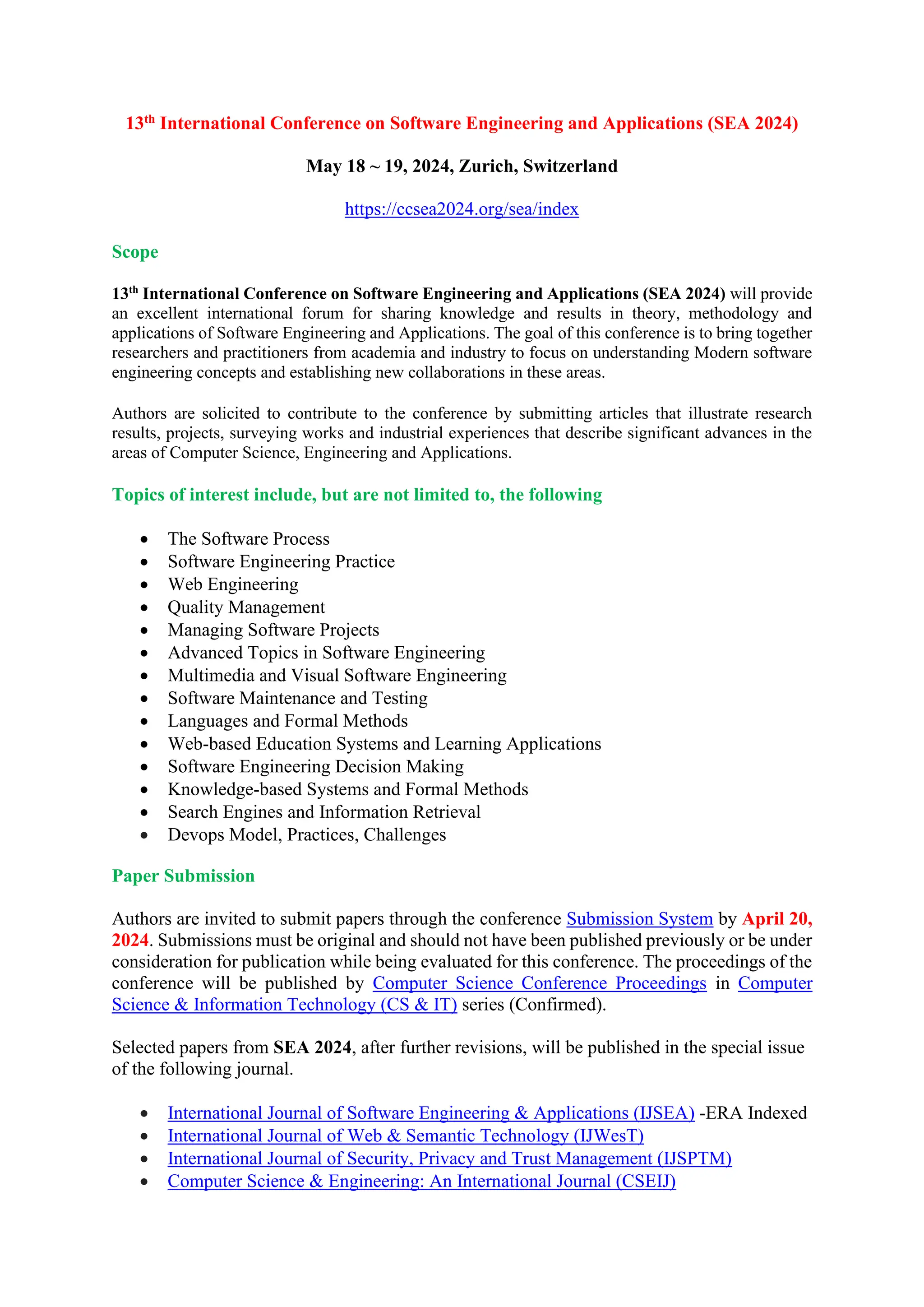 The 13th International Conference on Software Engineering and Applications (SEA 2024) will take place on May 18-19, 2024, in Zurich, Switzerland, providing a platform for researchers and practitioners to share advancements in software engineering. Authors are invited to submit original papers by April 20, 2024, with selected works being published in various journals after further revisions. Key topics include software process, quality management, web engineering, and more, encouraging collaborations across academia and industry.