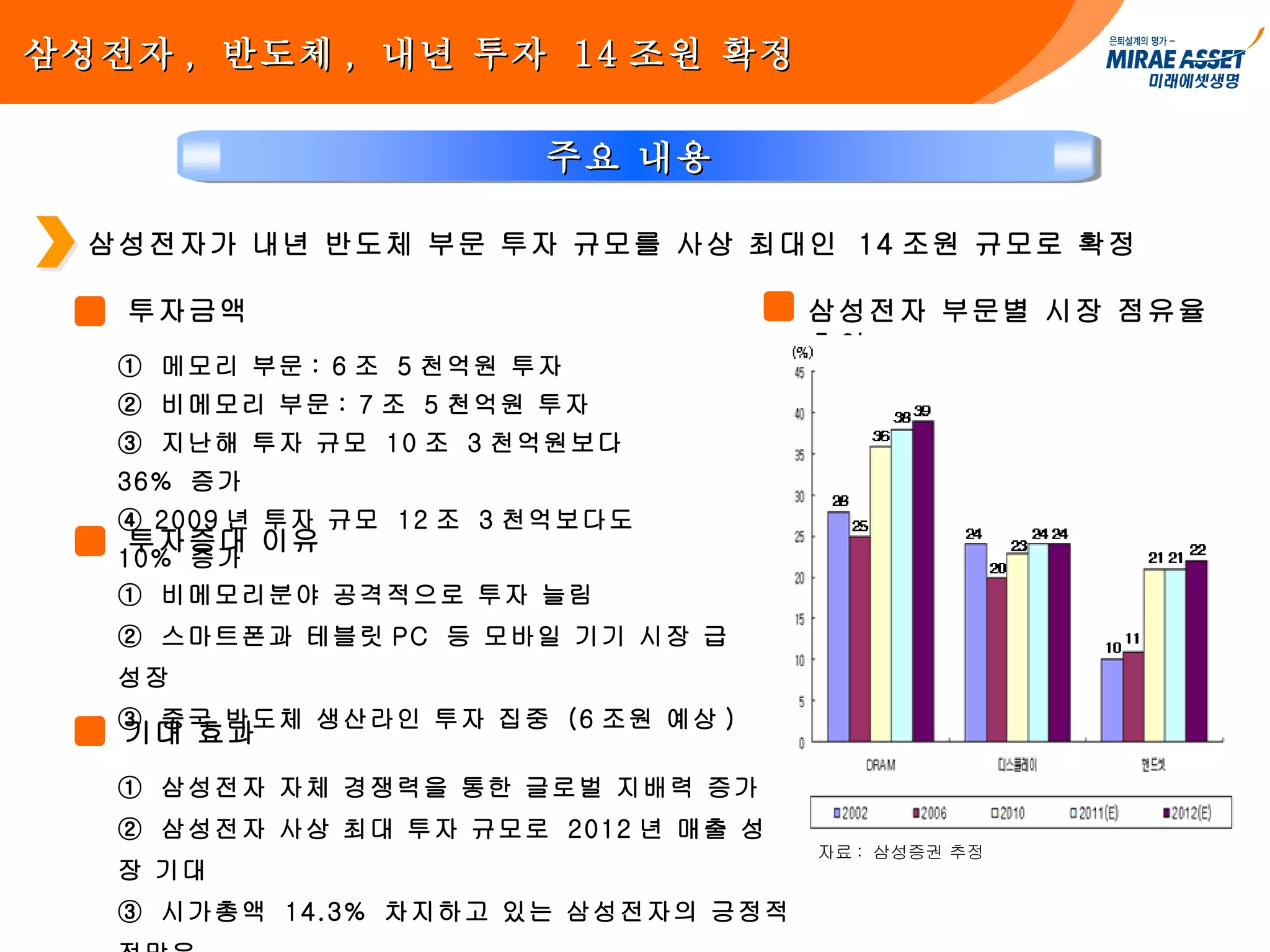삼성전자 반도체 내년 투자14조원 확정 1. 삼성전자 , 반도체 , 내년 투자 14 조원 확정 주요 내용 삼성전자가 내년 반도체 부문 투자 규모를 사상 최대인 14 조원 규모로 확정 투자금액 ① 메모리 부문 : 6 조 5 천억원 투자 ② 비메모리 부문 : 7 조 5 천억원 투자 ③ 지난해 투자 규모 10 조 3 천억원보다 36% 증가 ④ 2009 년 투자 규모 12 조 3 천억보다도 10% 증가 투자증대 이유 ① 비메모리분야 공격적으로 투자 늘림 ② 스마트폰과 테블릿 PC 등 모바일 기기 시장 급성장 ③ 중국 반도체 생산라인 투자 집중 (6 조원 예상 ) 기대 효과 ① 삼성전자 자체 경쟁력을 통한 글로벌 지배력 증가 ② 삼성전자 사상 최대 투자 규모로 2012 년 매출 성장 기대 ③ 시가총액 14.3% 차지하고 있는 삼성전자의 긍정적 전망은 국내 주가 상승의 주 원동력이 될 수 있음 삼성전자 부문별 시장 점유율 추이 자료 : 삼성증권 추정 2. 삼성전자 , 반도체 , 내년 투자 14 조원 확정 머니투데이 12 월 14 일자