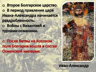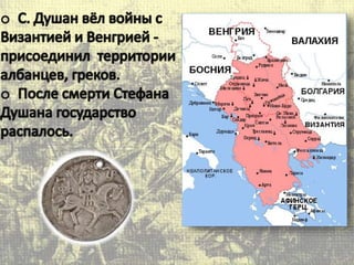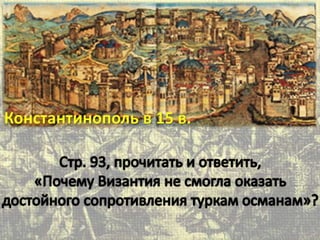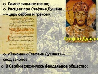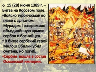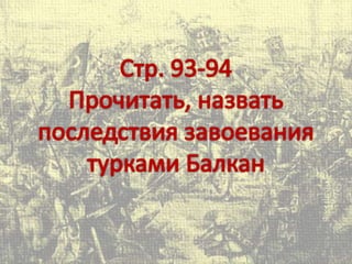 Документ обсуждает исторические события на Балканском полуострове в 14-15 веках, акцентируя внимание на последствиях битвы на Косовом поле в 1389 году и падения Константинополя в 1453 году. Упоминаются ключевые страны и государства южных славян, такие как Сербия и Болгария, а также важные правители, как Стефан Душан и Константин XI. Указаны задания для учащихся, включая чтение параграфов и повторение ранее изученного материала.
