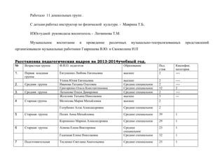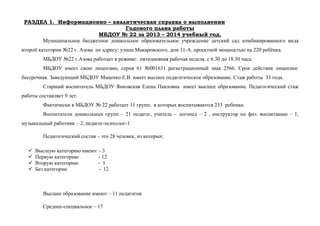 Документ представляет собой информационно-аналитическую справку о работе муниципального бюджетного дошкольного учреждения (МБДОУ) №22 за учебный год 2013-2014, включающую данные о количестве воспитанников, педагогическом составе и их квалификации. В документе также охватываются результаты участия учреждения в конкурсах и реализации образовательных программ, направленных на воспитание и развитие детей, в том числе здоровье и физическую активность. Объясняются цели и задачи педагогической деятельности, а также условия для оптимального развития детей в дошкольном учреждении.