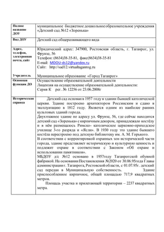 Доклад о деятельности муниципального бюджетного дошкольного образовательного учреждения «детский сад №12 «зоренька» представляет информацию о структуре, истории, функции и образовательных процессах детского сада, который был основан в 1957 году. В детском саду обучаются 107 детей в четырех возрастных группах, и обеспечивается возможность индивидуального образовательного маршрута. Также акцентируется внимание на сотрудничестве с культурными и образовательными учреждениями города для полноценного воспитательного процесса.