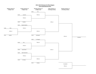 This document contains the schedule for the 2014-2015 Division II-A West Region Girls Basketball Bracket. It lists the matchups for each round of the tournament from Monday, February 9 to Saturday, February 14 at various host sites. Higher seeds will host the lower seeds in the earlier rounds, with the semifinals and finals taking place at Harding Academy on Friday and Saturday.