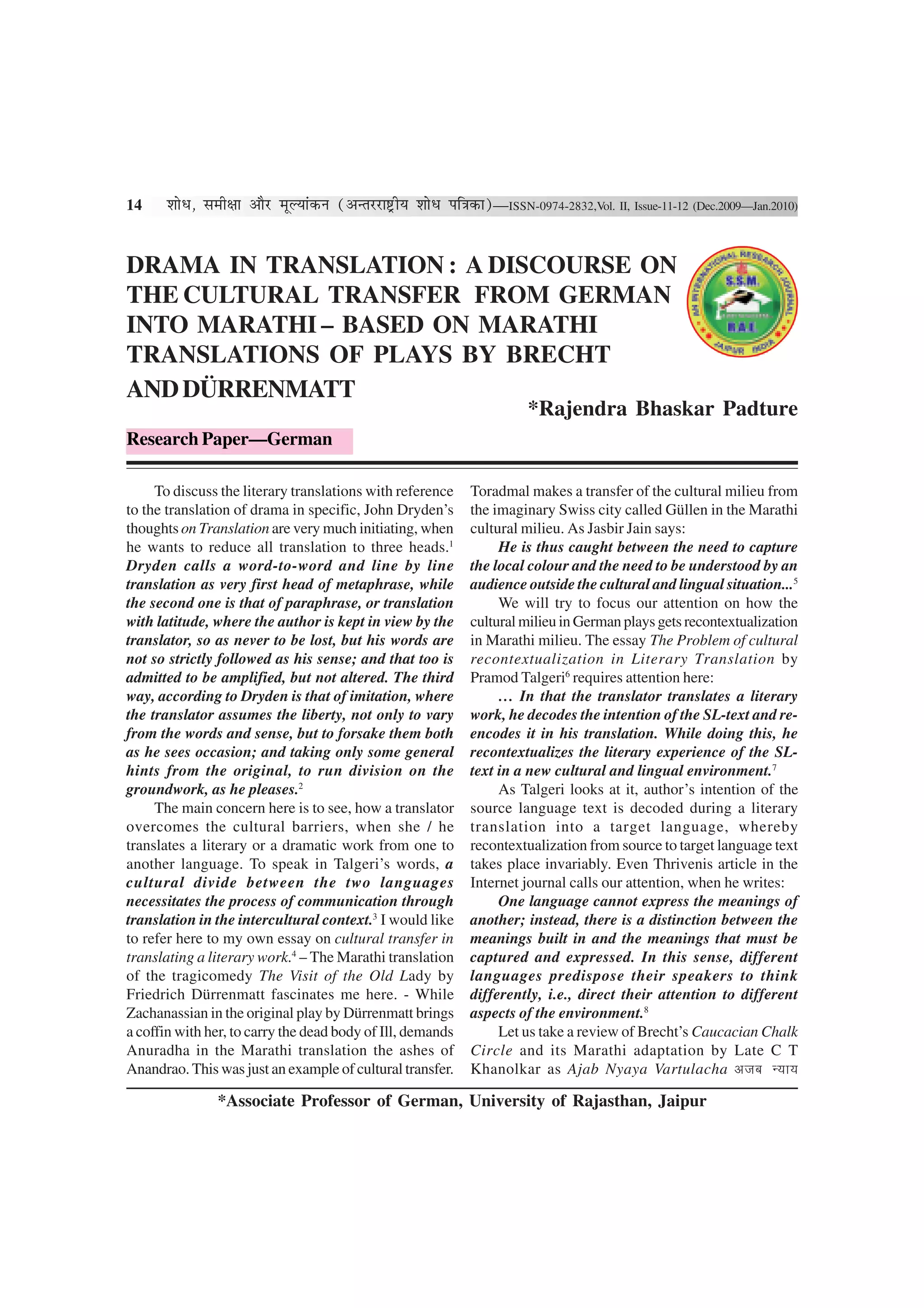 1) The document discusses the cultural transfer that occurs when plays are translated from German to Marathi, focusing on translations of works by Brecht and Dürrenmatt.
