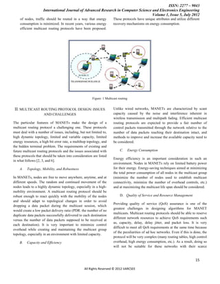This document summarizes an article that surveys energy efficient multicast routing protocols in mobile ad hoc networks (MANETs). It discusses the key challenges in designing such protocols, including high network dynamics due to node mobility, limited energy resources as nodes rely on batteries, and providing quality of service. It outlines different approaches taken by existing protocols to minimize energy consumption, such as reducing transmission power, distributing load across nodes, and putting nodes in sleep/power-down modes when idle. The purpose is to facilitate combining solutions to develop more energy efficient routing mechanisms for MANETs.