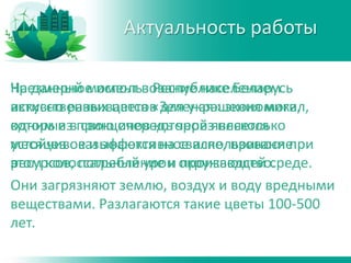 Документ обсуждает экологические проблемы, вызванные чрезмерным использованием искусственных цветов для украшения могил, которые наносят вред окружающей среде, загрязняя землю, воздух и воду. В рамках развития 'зеленой' экономики в Беларуси предлагаются альтернативы, такие как живые и биоразлагаемые цветы, а также цветы из биополимеров, которые могут быть компостированы. Работа направлена на снижение спроса на вредные искусственные цветы и решение проблемы отходов через устойчивые варианты утилизации.