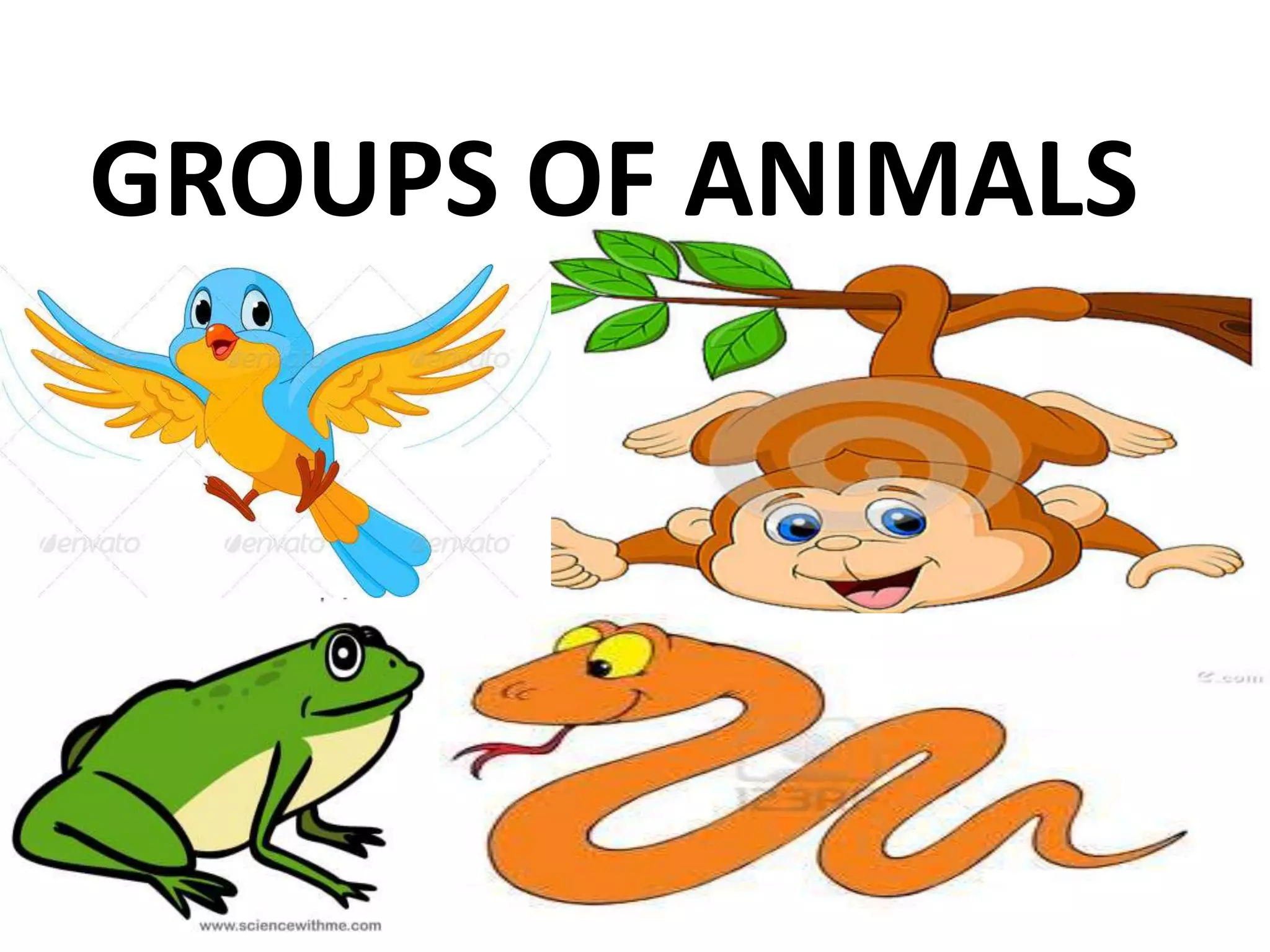 The document discusses different groups of animals including amphibians, birds, mammals, reptiles, and insects. It provides 3 key characteristics for each group: