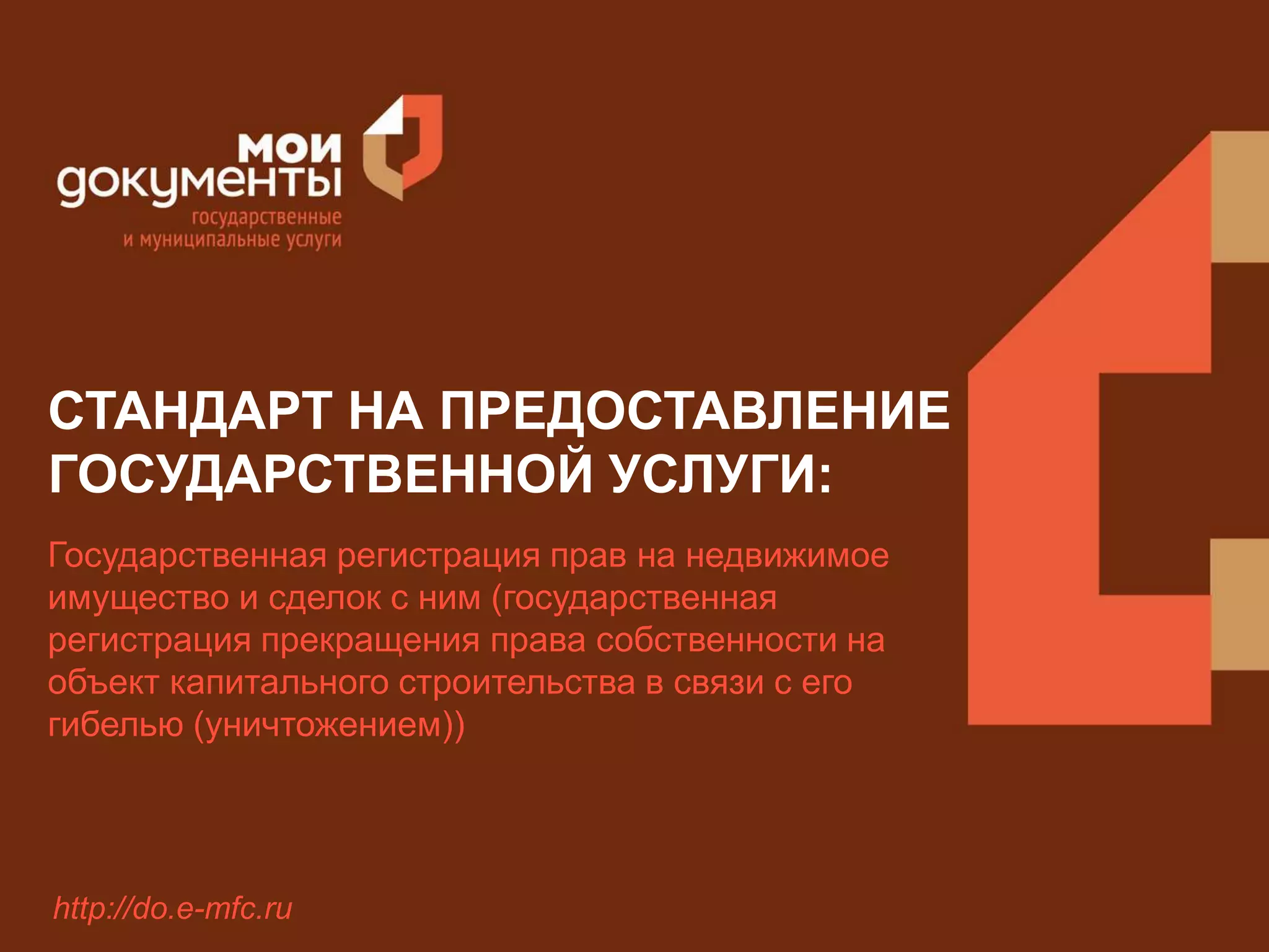 Документ описывает стандарт государственной услуги по регистрации прав на недвижимое имущество и связанные с ним сделки, включая прекращение права собственности на объекты капитального строительства. Он содержит информацию о требованиях к заявителям, необходимых документах, основаниях для отказа в регистрации и сроках предоставления услуги. Регистрация прав осуществляется за 7 рабочих дней, с особыми условиями для определённых категорий граждан.