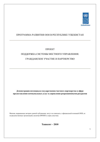 Документ описывает проект развития системы местного управления в Узбекистане, акцентируя внимание на роли государственно-частного партнерства (ГЧП) в улучшении инфраструктуры и предоставлении коммунальных услуг. Выделяются проблемы, связанные с низким качеством инфраструктуры, недоверием между государством и частным сектором, а также необходимость правовых и институциональных реформ для успешного внедрения ГЧП. Успешное развитие ГЧП рассматривается как важный шаг к преодолению инвестиционного дефицита и улучшению качества жизни населения.