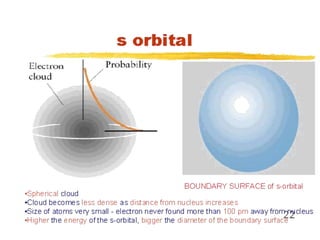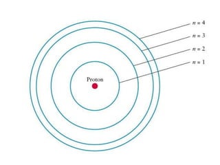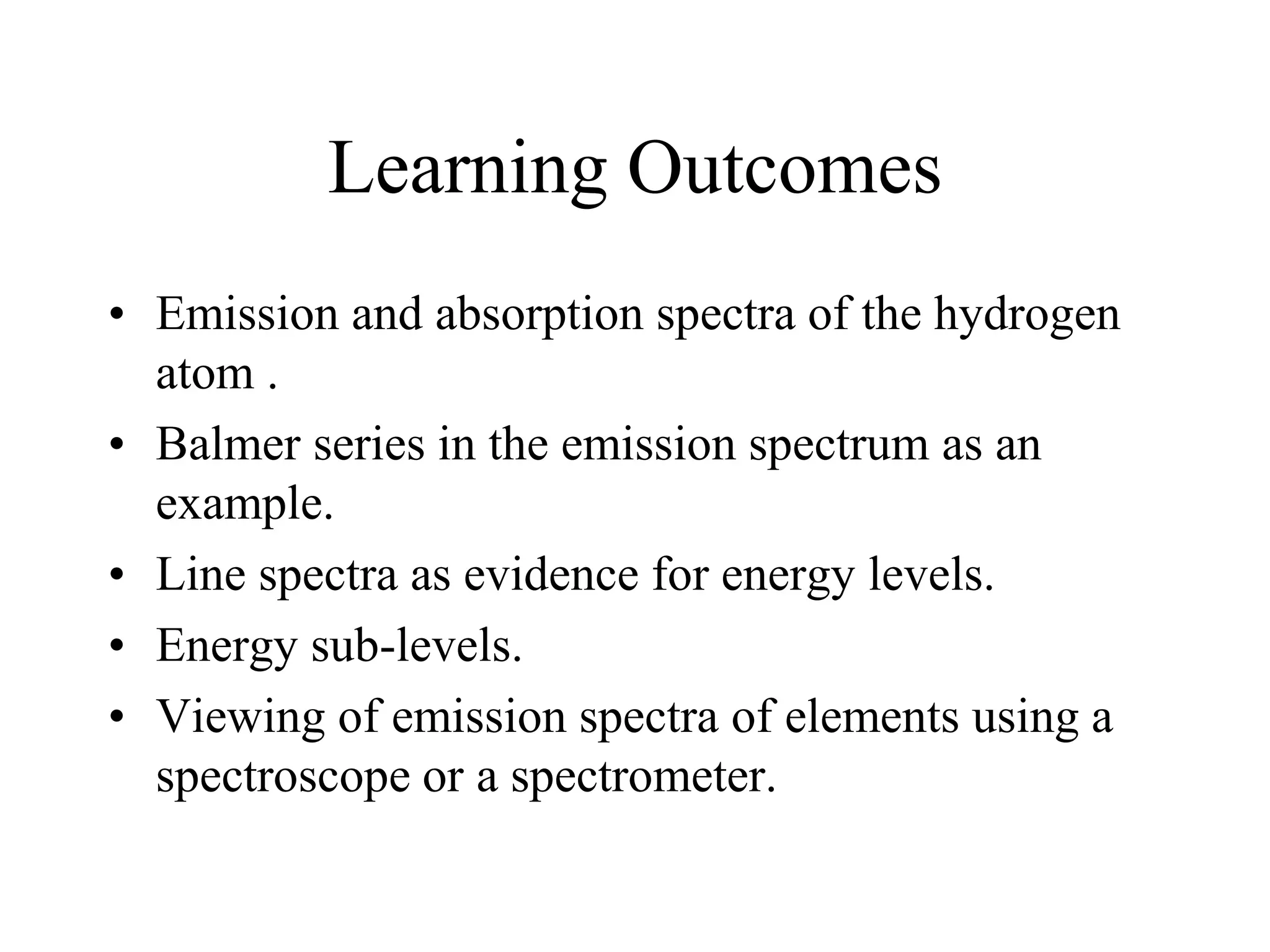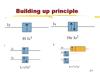 The document discusses atomic structure and spectra. It begins by introducing emission and absorption spectra of hydrogen atoms and defines the Balmer series. It then explains that line spectra provide evidence for discrete energy levels in atoms. The document discusses atomic orbitals and electronic configurations, including how electrons fill different sub-levels based on the Aufbau principle, Hund's rule, and Pauli's exclusion principle. Spectroscopes are described as devices used to observe emission spectra of elements.