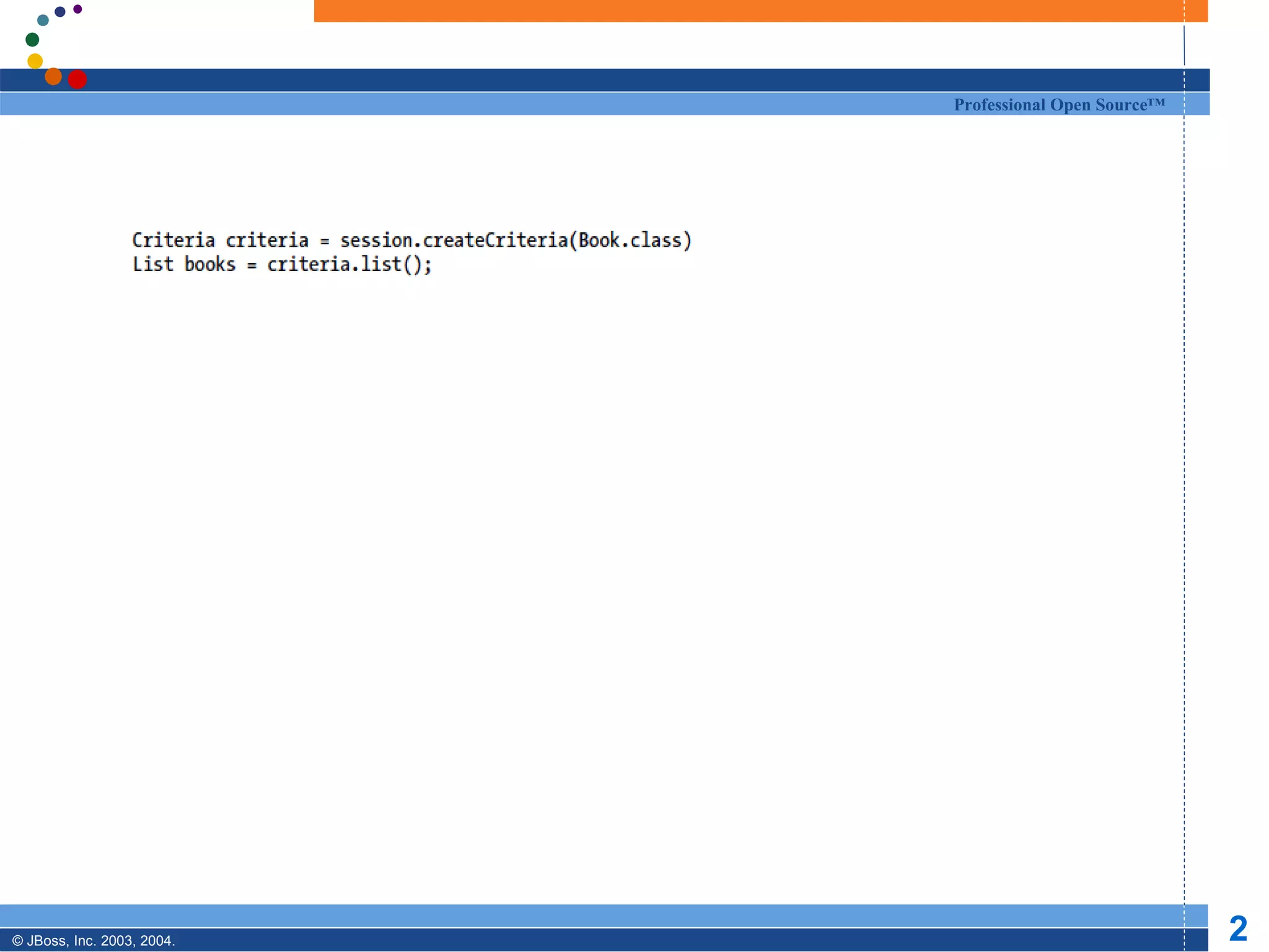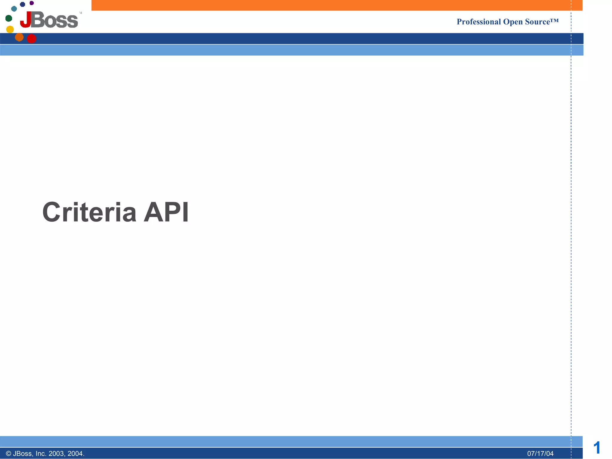 The document discusses the Criteria API for querying data in Hibernate. It describes features like restrictions, projections, grouping, match modes, and using detached criteria. When querying without an open session, a detached criteria can be instantiated and later attached to a session for execution by calling getExecutableCriteria() and passing the session.