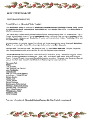 - Information is also provided about taking a trip to the Adirondacks for winter activities like skiing, snow tubing, and visiting Santa's Workshop.