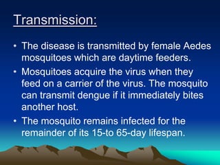 Dengue fever is an acute febrile illness lasting 2-7 days, presenting symptoms such as headache, rash, and hemorrhagic manifestations, primarily transmitted by female Aedes mosquitoes. The clinical spectrum includes dengue fever, dengue hemorrhagic fever (DHF), and dengue shock syndrome (DSS), with DHF and DSS involving severe complications like plasma leakage and bleeding. Treatment is mainly supportive, with careful monitoring of platelet counts and hematocrit, while serious cases may require intravenous fluids and blood transfusions.
