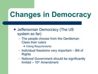 - The Jacksonian era saw an expansion of democracy, with more common men able to vote without property requirements, and representatives coming from the common people rather than just the gentleman class.