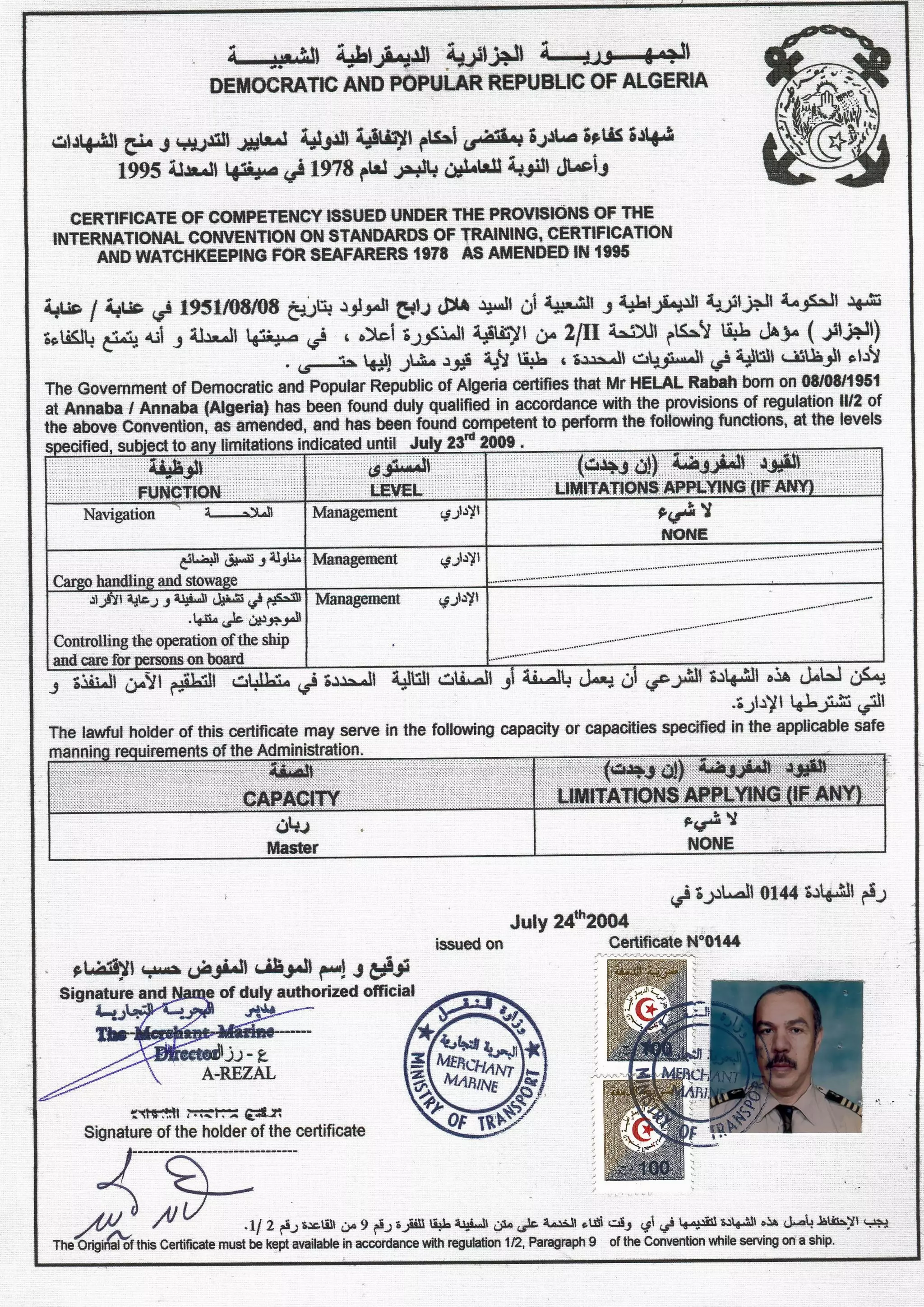 Dossier Complet Maritime Rrabah HELAL / CLC / OMI/BIT/OIT