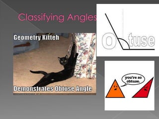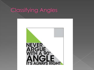The document discusses angles and how to measure them using a protractor. It provides examples of angles in everyday life and notes that the ancient Babylonians were the first to divide a circle into 360 equal parts called degrees. It explains how to properly use a protractor to measure angles, including making sure the protractor is lined up with the vertex of the angle and reading the measurement. The document also classifies different types of angles such as acute, right, obtuse, and straight angles.
