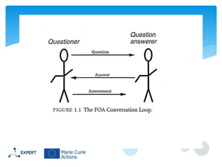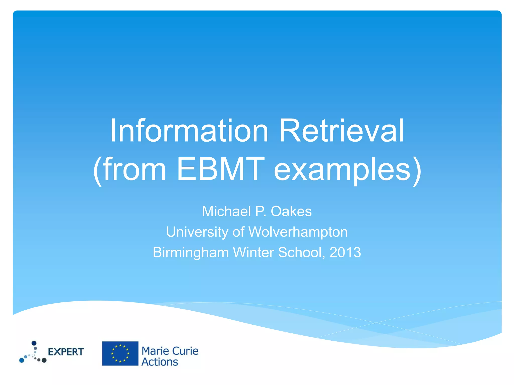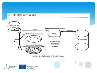 This document discusses information retrieval and describes its three main phases: 1) asking a question to define an information need, 2) constructing an answer by matching queries to documents, and 3) assessing the relevance of the retrieved answers. It also covers several important information retrieval concepts like keywords, indexing documents, stemming words, calculating TF-IDF weights, and evaluating system performance using recall and precision.