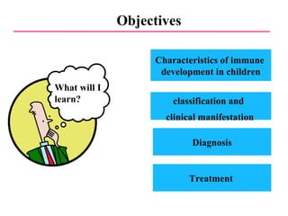 This document discusses a case presentation of a 2-year-old boy named D. George who has been brought in by his parents due to concerns about recurrent infections. The boy has a history of frequent upper respiratory infections and ear infections, and has been hospitalized twice for infections. The document provides background on primary immunodeficiency diseases and different aspects of the immune system to help evaluate the child's condition and determine if he has an immunodeficiency.
