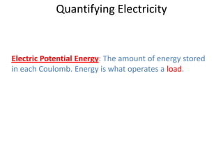This document summarizes key concepts about quantifying electricity including electric potential energy, electric potential difference (voltage), and how to calculate energy using voltage and charge. It defines electric potential energy as the amount of energy stored in each coulomb, measured in joules. It explains that voltage is the difference in electric potential energy on either side of a source or load, measured in volts. It provides an analogy that voltage is like the height of a waterfall, with higher voltage meaning more energy. Finally, it gives the formula that potential difference equals energy divided by charge, and provides an example calculation of energy used by a hair dryer.