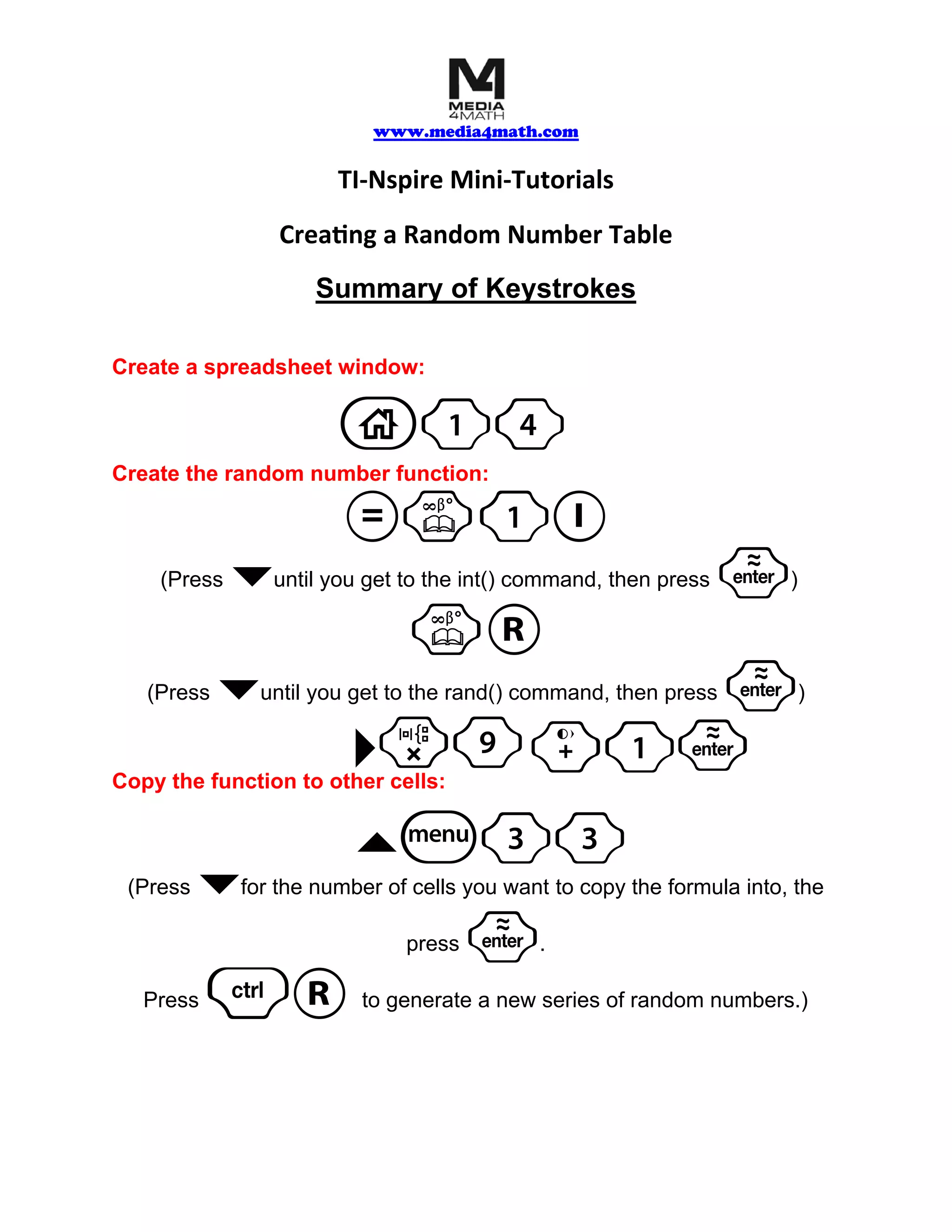 This document provides instructions for creating a random number table using a TI-Nspire calculator. It outlines the keystrokes needed to 1) open a spreadsheet window, 2) create a random number function using the int() and rand() commands, and 3) copy this function to other cells and generate new random numbers by pressing /R. The goal is to generate a table of random numbers for use in math activities.