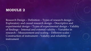 This document provides an overview of research design topics including definitions, types of research design, and key concepts. It defines research design as a comprehensive plan or blueprint for conducting a research study. The main types of research design discussed are exploratory, causal, descriptive, and experimental. Exploratory research is aimed at formulating problems or hypotheses, while causal research seeks to determine cause-and-effect relationships. Descriptive research observes associations between variables, and experimental research tests hypotheses through manipulation of the independent variable. Key concepts explained include variables, hypotheses, experimental and control groups, and validity. The document also outlines the stages of developing a research design and merits of having a well-planned design.