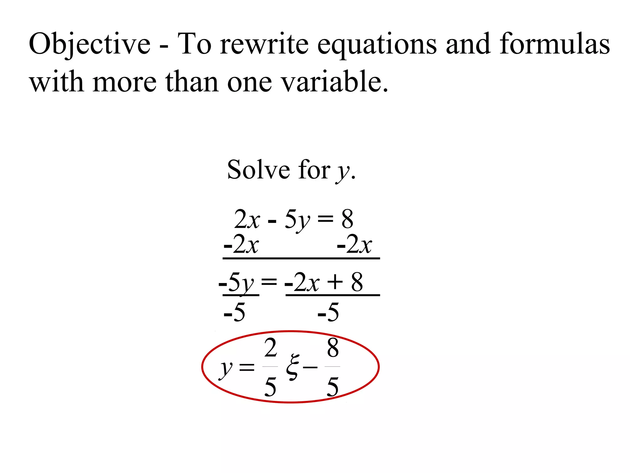 The document contains instructions on rewriting equations and formulas with multiple variables. It provides two examples of rewriting equations to solve for y by combining like terms. It also lists four formulas and asks to solve each for the indicated variable, which are t, T, H, and an unspecified variable.