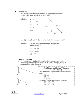 This document provides information on right triangle trigonometry including definitions of basic angle types, right triangle properties, the Pythagorean theorem, trigonometric ratios, and how to solve right triangle problems. It defines trigonometric functions like sine, cosine, and tangent in terms of an acute angle and adjacent/opposite sides. Examples are given for finding missing side lengths and converting between angle units. Practice problems apply the concepts to evaluate trig functions and solve application problems involving heights, distances, and angles of elevation/depression.