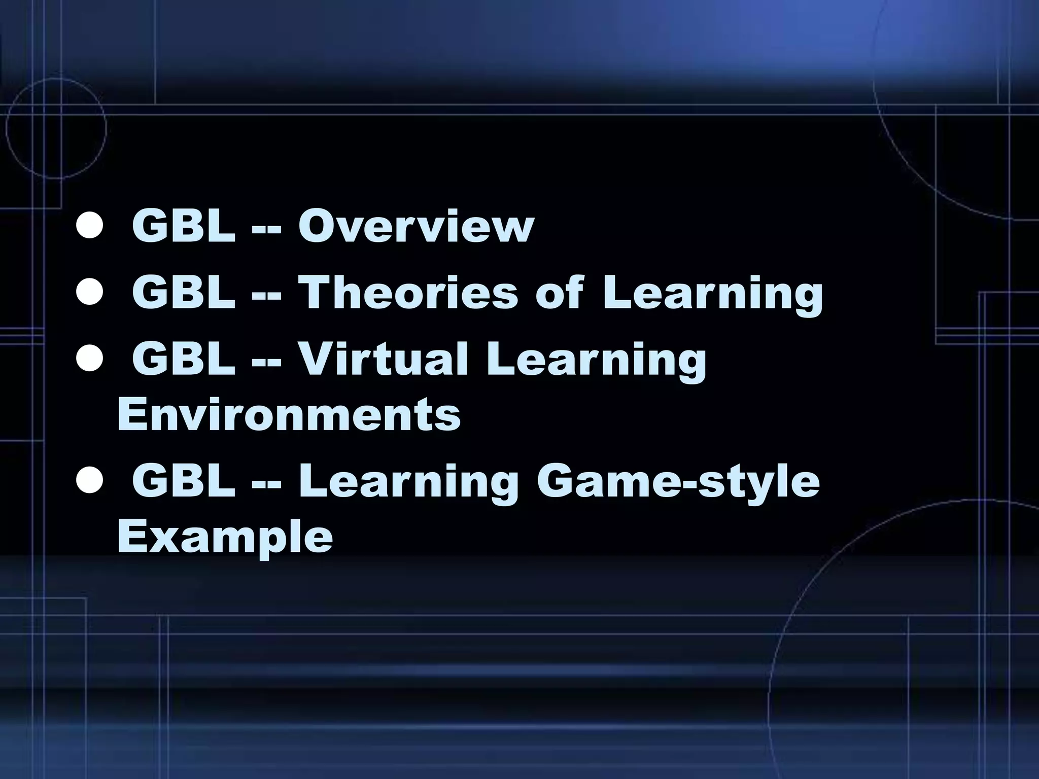 This document discusses game-based learning (GBL) and covers several topics: