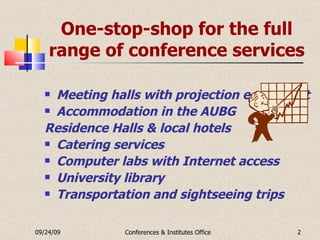 The document advertises American University in Bulgaria as a host for conferences and seminars. It provides details on their facilities and services, which include meeting halls, accommodations, catering, computer labs, transportation, and sightseeing activities. Their team has over 13 years of experience organizing over 300 events. They aim to provide full conference support and services at affordable prices.