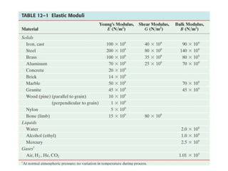The document discusses key concepts in material mechanics including Hooke's law, elasticity limits, stress and strain, Young's modulus, and fracture. Hooke's law states that the elongation of an object is proportional to the applied force up to the proportional limit, beyond which the object is permanently deformed at the elastic limit. Young's modulus describes the relationship between stress, strain, and a material's properties. Stress is defined as force per unit area while strain is the ratio of change in length to original length. Materials can fracture if subjected to stresses greater than their ultimate tensile strength.
