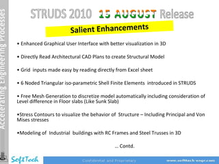 This document summarizes new features and enhancements in the STRUDS structural analysis and design software, including improved 3D visualization, direct import of CAD plans, automatic mesh generation, stress contour visualization, modeling of industrial structures, improved seismic and slab design, minor bug fixes, and more.