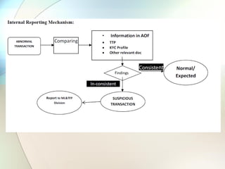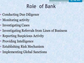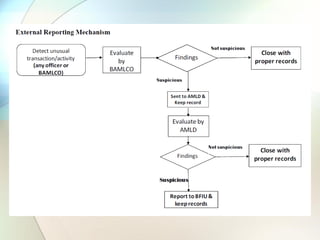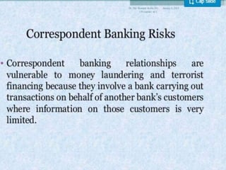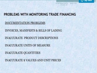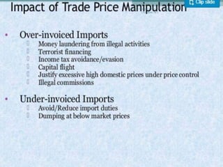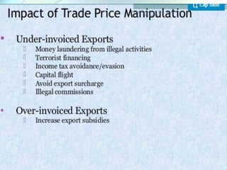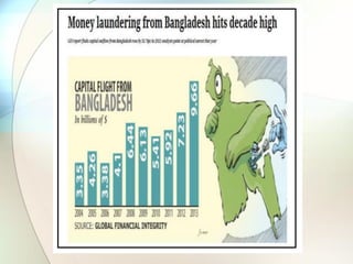 The document discusses trade-based money laundering (TBML) and the regulatory framework in Bangladesh to combat it. It notes that the Financial Action Task Force recognized TBML as a major method for criminal groups to launder money. It then summarizes that an estimate found nearly $50 billion was siphoned out of Bangladesh via TBML from 2005-2015, according to Global Financial Integrity. The document outlines various TBML risks and red flags that banks like Sonali Bank should be aware of to help prevent TBML and illicit financial outflows.
