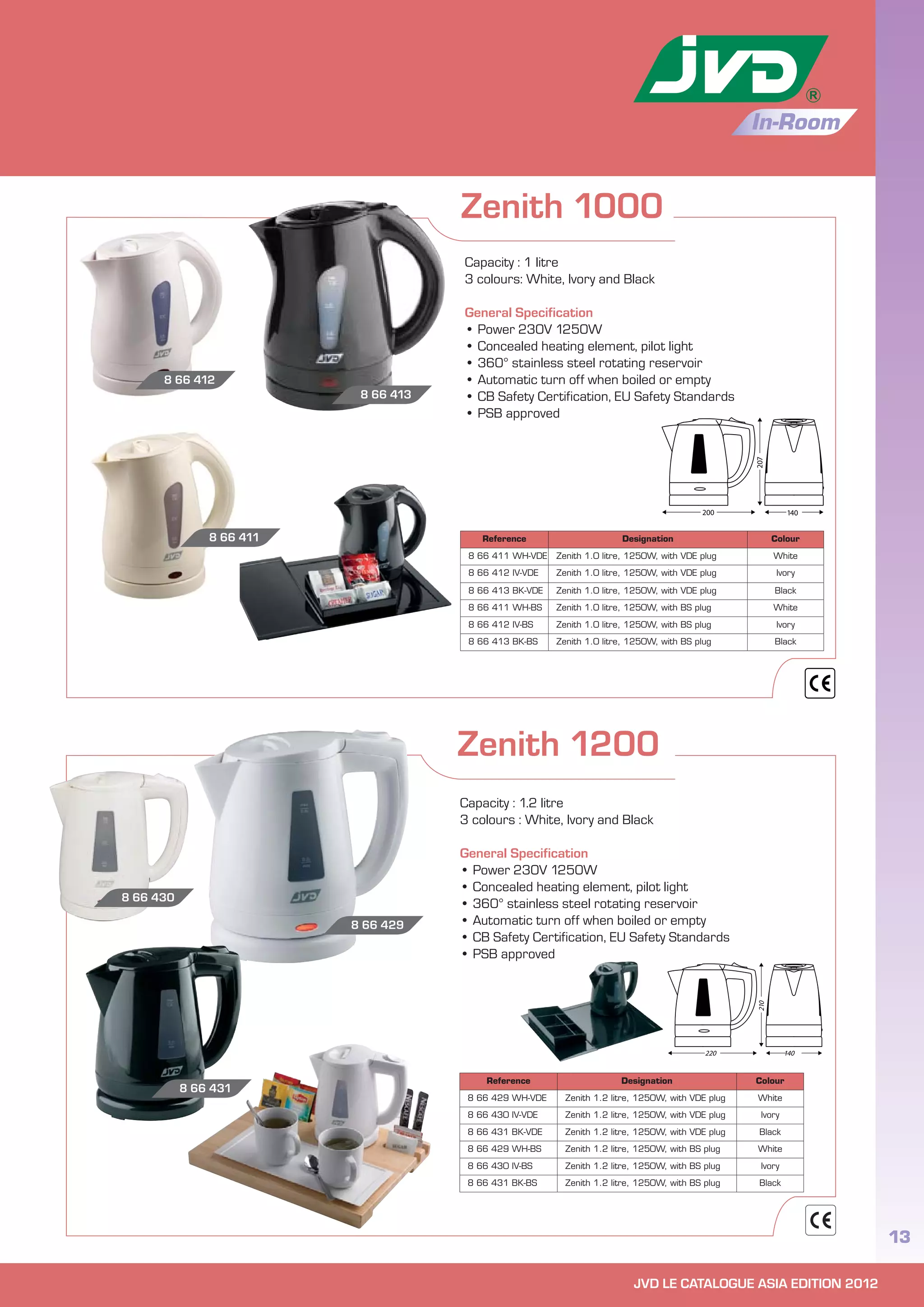 This document contains a catalogue listing for two electric kettles, the Zenith 1000 and Zenith 1200. For each kettle, it provides the reference designation, color options of white, ivory and black, capacity in liters, power specifications and safety certifications. Both kettles have a concealed heating element, rotating reservoir, automatic shut-off and safety certifications from various organizations. They differ only in capacity, with the Zenith 1000 holding 1 liter and the Zenith 1200 holding 1.2 liters.