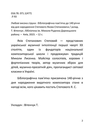 Яків Степанович Степовий — представник української музичної інтелігенції першої чверті XX століття, один із фундаторів національної композиторської школи і продовжувач традицій Миколи Лисенка. Майстер солоспівів, хорових і фортепіанних творів, автор музичних збірок для дітей, музично-просвітній діяч, пропагандист світової класики в Україні.