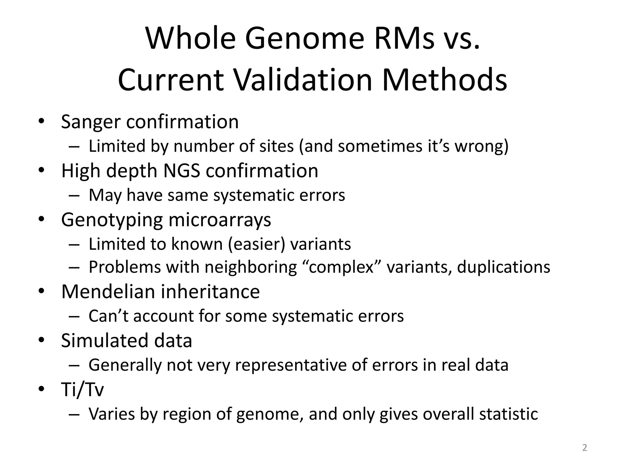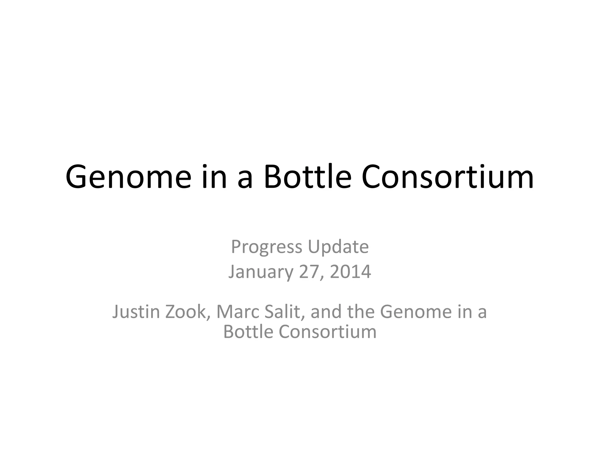 The Genome in a Bottle Consortium provided a progress update on integrating datasets from multiple sequencing platforms to generate highly confident genotype calls for use as a reference material. They integrated 12 datasets from 5 platforms and used evidence of bias and concordance across datasets to identify confident regions. They are working to characterize more complex and uncertain regions, and to validate calls using pedigree and long read sequencing data. Future work includes characterizing additional genomes from diverse populations and cancer samples.