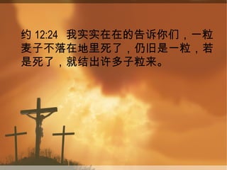 约 12:24 我实实在在的告诉你们,一粒 麦子不落在地里死了,仍旧是一粒,若 是死了,就结出许多子粒来。