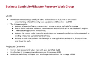 The document outlines goals and a projected outcome for a Business Continuity/Disaster Recovery Work Group at Harvard University. The goals are to develop an overall BC/DR strategy by June 30th that addresses events management, escalation processes, roles and responsibilities, applications and services, and provides architectural guidance. The projected outcome is to complete a current state assessment, develop a future state strategy with identified gaps, and a preliminary multi-year plan and budget by June 30th. The HUIT BC/DR vision is to have established processes, defined roles, and resilient systems that can withstand and recover from minor to major incidents to support continuity of technology services for the University.