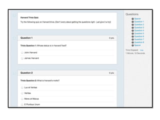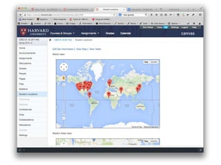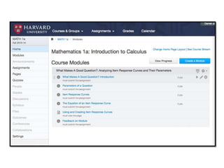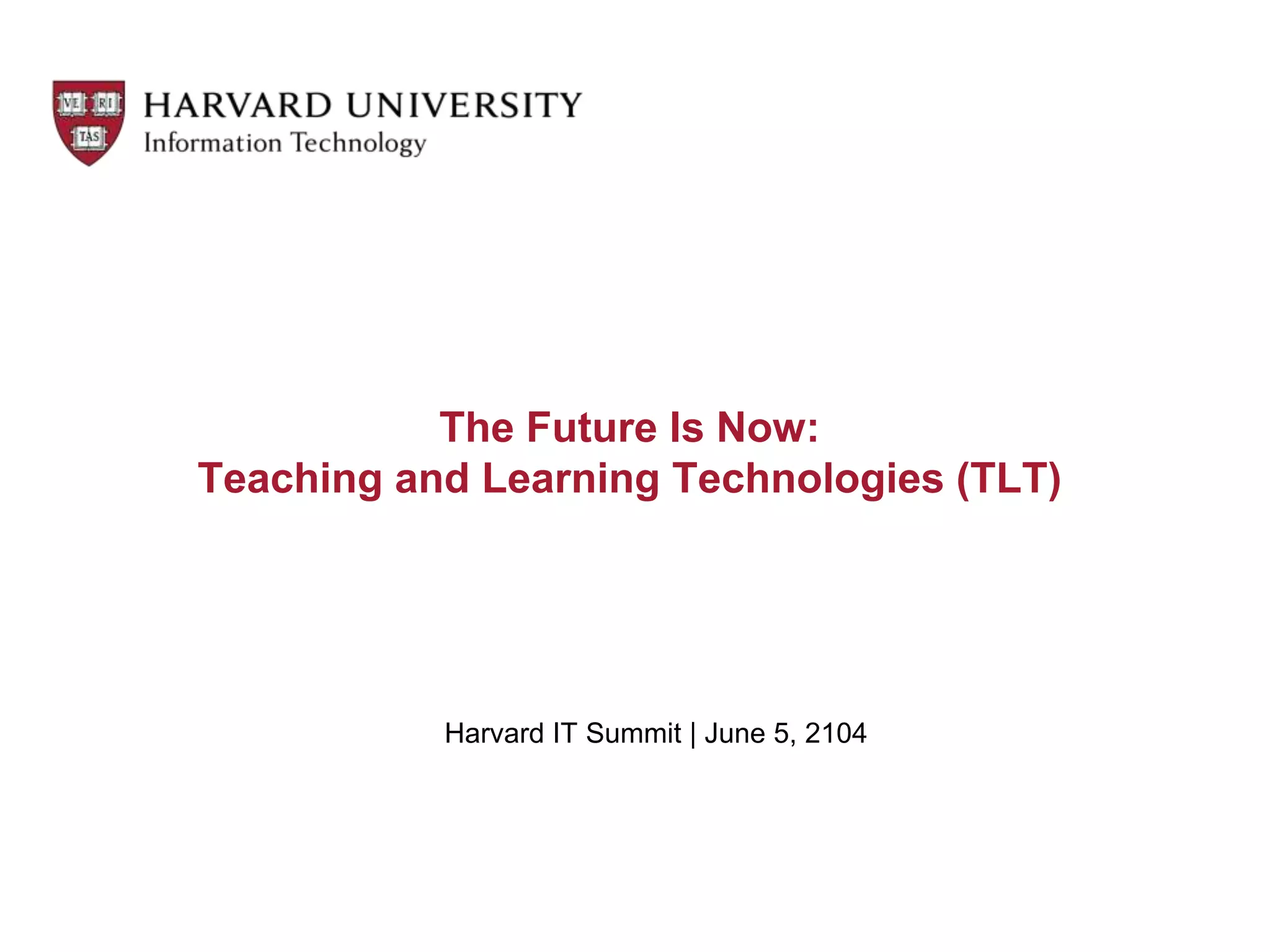The document provides an overview of Harvard's Teaching and Learning Technologies (TLT) program. It discusses the program's strategic objectives to provide core teaching technologies, support pedagogical innovation, establish partnerships, and cultivate an open source community. An update on migrating courses to the new Canvas platform is provided, including pilot results. Case studies demonstrate how Canvas has been used for courses. The developer community is introduced as a way to contribute code and tools.