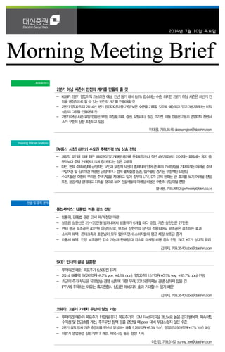 - 최근의 주가 부진은 유료방송 경쟁 심화에 대한 우려. 2015년까지는 경쟁 심하지 않을 것