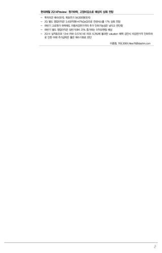 - 별도기준 2H14 영업이익은 3Q 3,250억원(-5%QoQ), 4Q 3,920억원(+20%QoQ)로 1H14