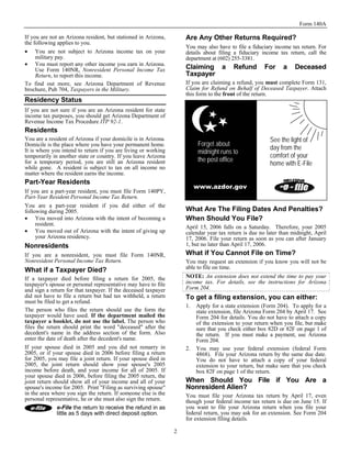 This document provides instructions for completing Arizona's Form 140A personal income tax return for 2005. It outlines who must file, basic filing requirements, definitions of residency, filing dates and penalties. Key points include: - You must file if your Arizona gross income or adjusted gross income is at least $15,000, regardless of your filing status. - Residents must report income from all sources, including out-of-state income. Nonresidents only report Arizona-sourced income. - The deadline for filing is April 17, 2006. Late filers may face penalties including late fees and interest charges. - Free electronic filing is available through the Arizona Department of Revenue website, offering quick