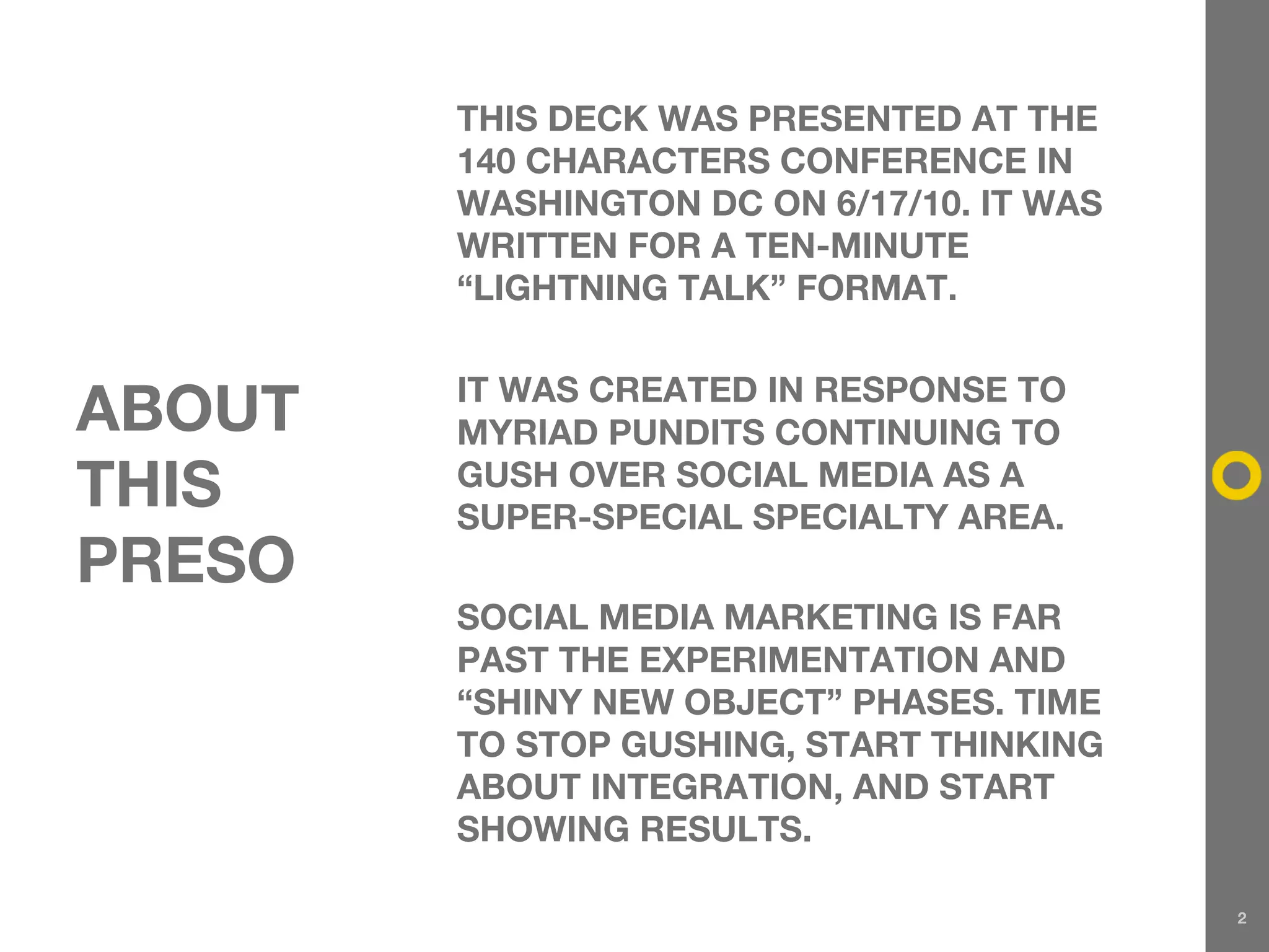 The document argues that instead of a separate social media strategy, marketers should focus on an integrated engagement, influence, and activation strategy aligned with clients' business goals. It emphasizes the importance of blending traditional and social media efforts, using a successful case study of a campaign for Knorr's Sidekicks as an example. The conclusion highlights that strong, integrated creative strategies are essential for achieving significant market impact.