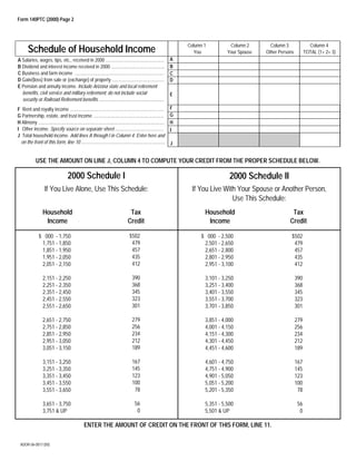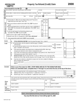 This 3 sentence summary provides the high level information from the Arizona property tax refund claim document: The document is an Arizona property tax refund claim form for tax year 2000, where the claimant provides their personal information and answers questions to determine if they qualify for the refund based on being an Arizona resident, age, income level, and whether they paid property taxes or rent. The claimant is instructed to provide the total household income and their property taxes paid, and the form calculates the potential refund amount.