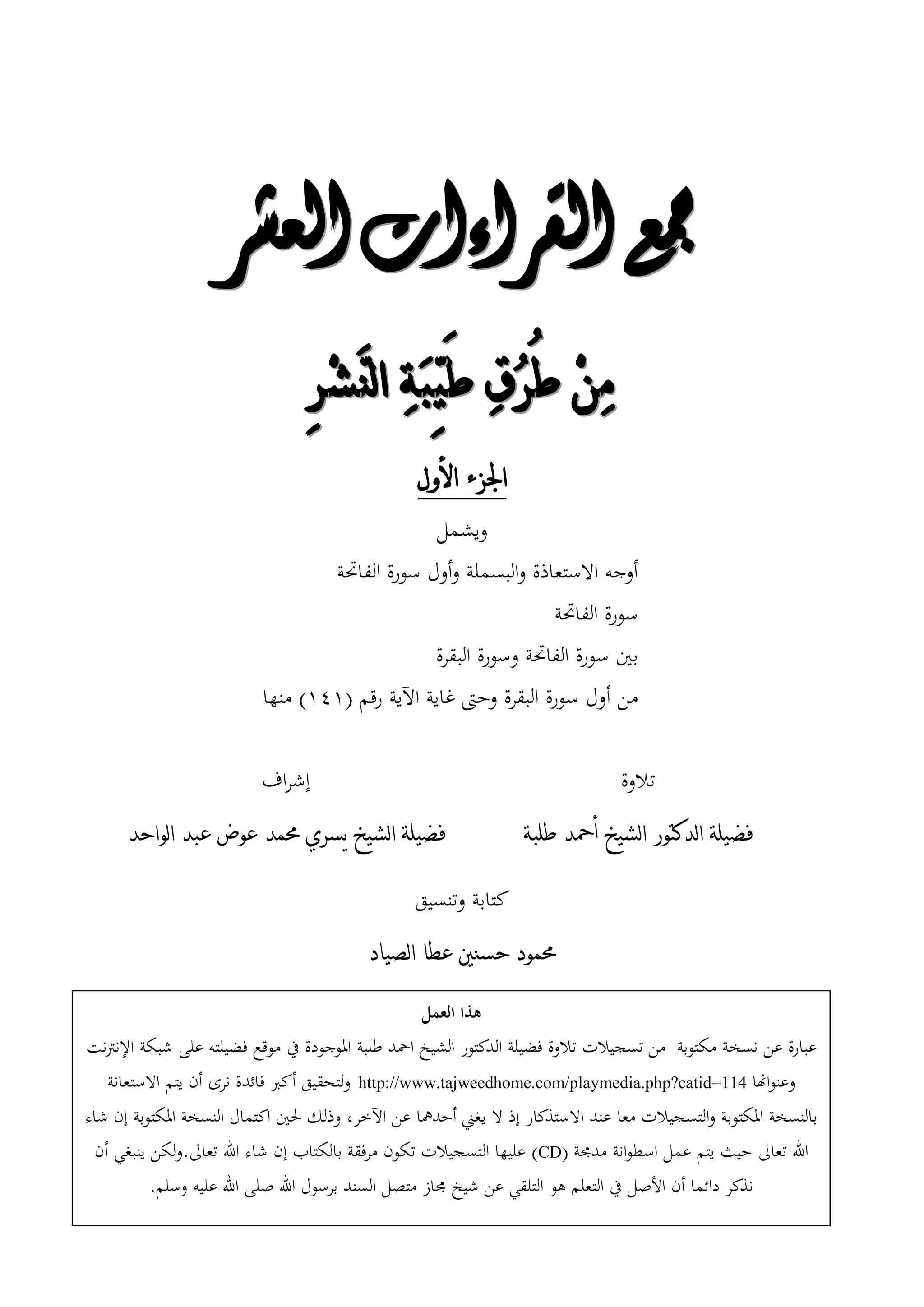 يتناول هذا الوثيقة موضوع العشر القراءات من القرآن الكريم، مع التركيز على التقنيات والأساليب المستخدمة في تعلم وتدريس هذه القراءات. يتضمن العمل سرداً للأوجه المختلفة في السور والآيات، ويشدد على أهمية التلقي والتعلم من العلماء. كما يتحدث عن طريقة التوثيق والتسجيل للمساعدة في الاستذكار وتحقيق الفائدة من هذه القراءات.