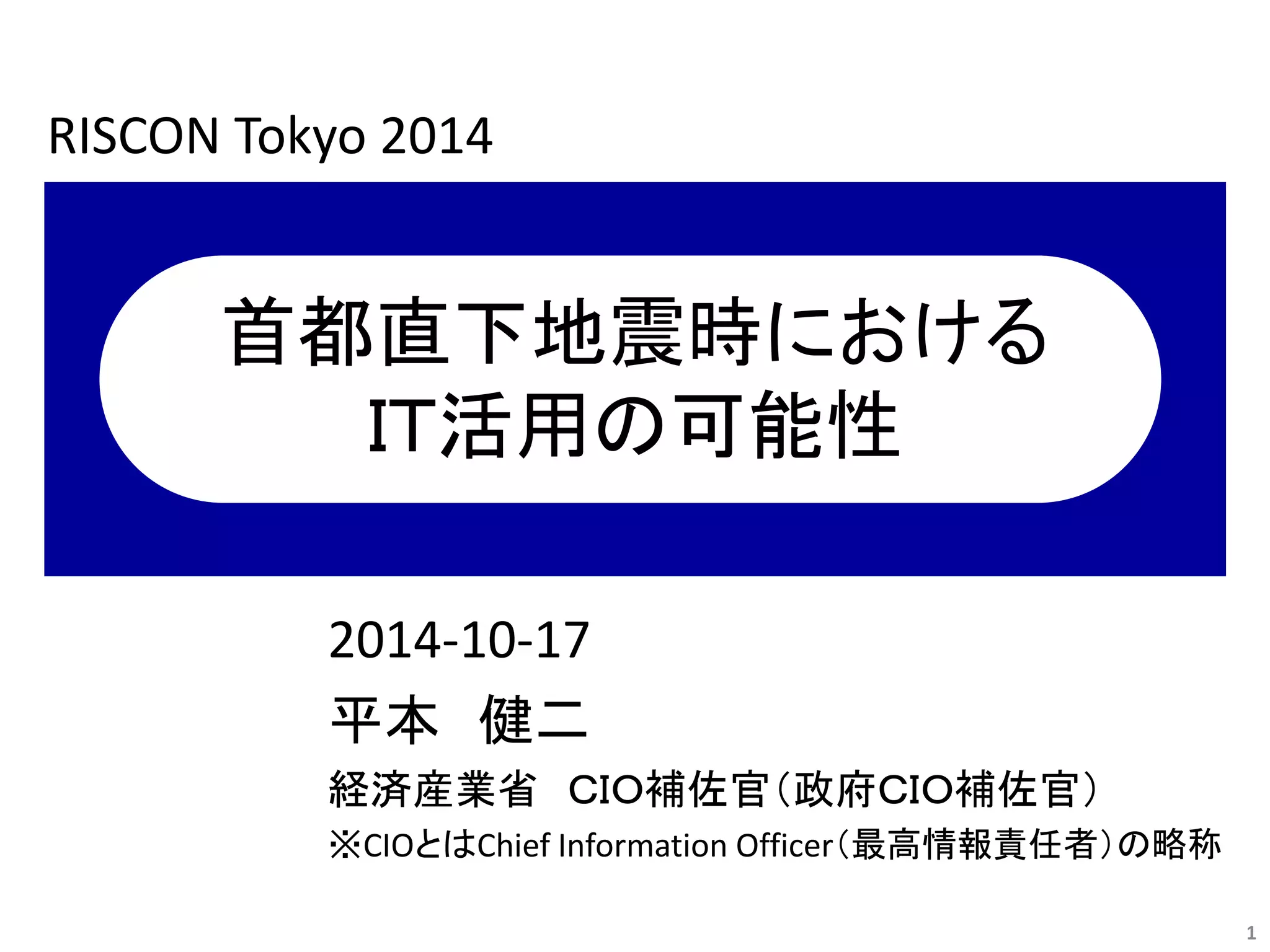 SNS等、日常的な工夫で大きな効果が得られるものも多い。 ITコミュニティの形成は非常に心強い状況である。日ごろか らの関係構築が重要である。 災害に対するIT活用で、考える点は2点。 1. デュアルユースで使えるか。そうでない場合には、災害時に確実に 使ってもらう対策があるか。 2. 明日でも使えるか 105