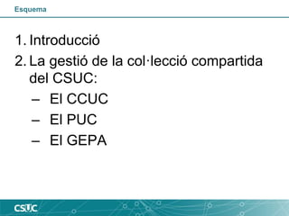 Presentació sobre el CCUC, el PUC i el GEPA, adreçada als alumnes de l’assignatura de "Desenvolupament de col·leccions" del Grau de Biblioteconomia i Documentació de Facultat de Biblioteconomia i Documentació de la Universitat de Barcelona.